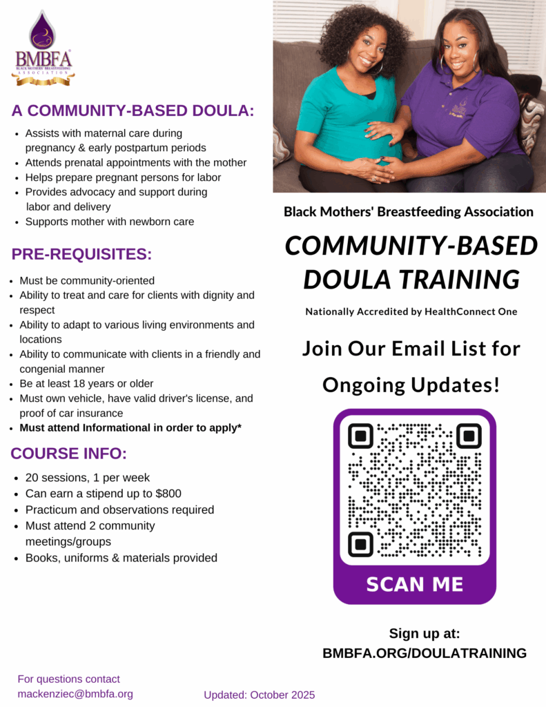 Black Mothers Breastfeeding Association BECOME A CERTIFIED COMMUNITY-BASED DOULA Stay Updated Need more info? Contact MacKenzie Currie at (313) 319-1774 or MackenzieC@bmbfa.org